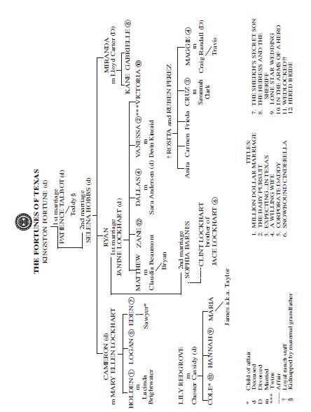 “And how will you do that with her living here at the ranch and you living fifty miles away in San Antonio?” she asked. “No, son, there’s only one way to do this, and that’s to dive in headfirst. Besides, I want to be a grandmother, not another parent. I’ve raised my family, and I did it pretty much on my own, as you well know. I want to concentrate on other things now. It’s only fair. And your uncle Ryan really needs my help with the business right now. This kidnapping mess and the divorce are enough for any one man to handle on his own.”