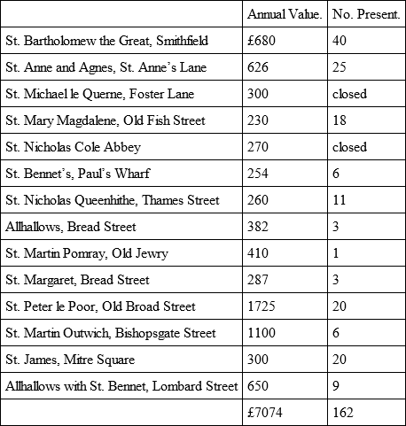 In the City of London the Church does not seem to thrive. The Church Times published a kind of census of fourteen of the City churches drawn up after personal inspection during service time not long ago. It gives the value of the benefice, and the number of persons actually present when the correspondent entered the church.