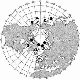Breeding distribution of the fulmar, showing the approximate preponderance of dark birds in the populations, indicated by the dark parts of the circles (from Fisher, 1952)