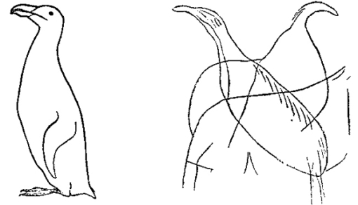 Upper Palaeolithic (probably Magdalenian) rock-engraving at El Pendo, near Santander, North Spain, showing what are probably great auks of which modern sketch on left. (After H. Breuil, 1911; G. Clark, 1948)
