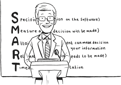 There’s an old saying: If you don’t know where you’re going, you’ll never get there. It’s essential to have a clear idea of what you want and what’s possible in the time available. Better to aim low and hit your target than be too ambitious and miss completely; so write down a sentence defining your goal: After my presentation, management can make a decision about whether or not to implement the proposed software.