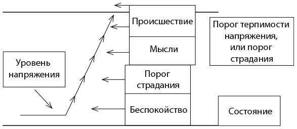 Верхняя линия схемы представляет собой пороговый уровень терпимости к напряжению, который также можно назвать порогом страдания. Не будем забывать, что иногда напряжение становится следствием неосознаваемых желаний, которые зачастую уходят корнями в раннее детство.