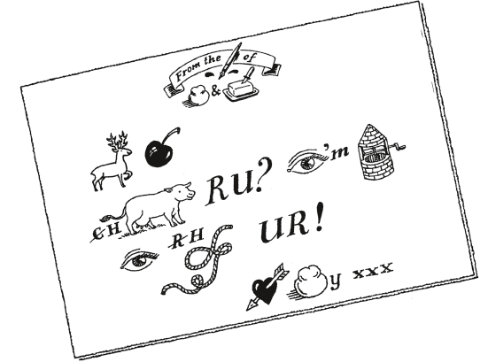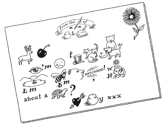 She says that if I love her I’ll try and love Slimey, for her sake. I’ve tried. But how can you love someone who has freckles and makes these awful jokes all the time? Another thing he does, he shoves these cards under the bedroom door while I’m asleep. It’s really creepy. I find them lying there waiting for me when I wake up. They’re all covered in these soppy drawings which I think are supposed to be messages. I don’t bother to read them. I just chuck them straight into the waste-paper basket.