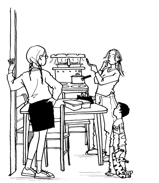 In the kitchen, Mum was putting on her make-up, filling lunch boxes, getting breakfast, dressing Sammy. Sammy is my little brother. He’s four years old and is even more spoilt than Kez and Lisa. This is because he’s a boy. There is a lot of sexism going on in my family.