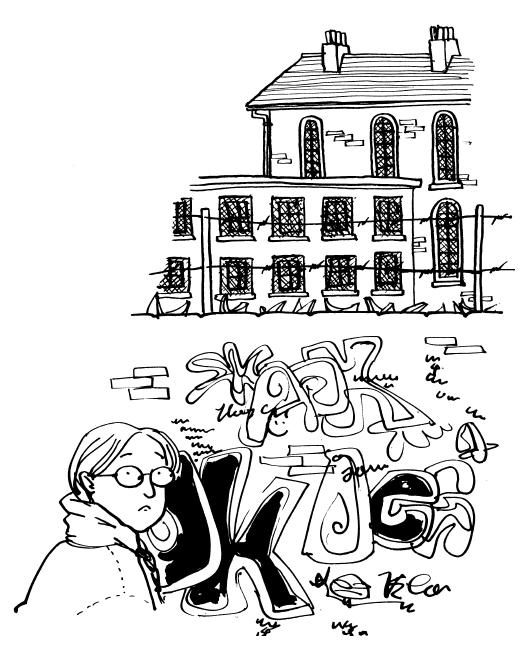There’s this wire mesh stuff over the windows, to stop them from being broken, and the walls are always covered in graffiti. Every term the graffiti’s removed and every term it comes back again. I think some graffiti’s quite pretty and I don’t know why people object to it. But the stuff on our school walls is mostly just ugly, same as on our block of flats. If Mum’d seen them she would’ve known why I hated school so much, but Mum had enough to cope with, what with Dad, and work, and the tiresome trio, so she hardly ever went to parents’ evenings. Actually, I don’t think many other parents did, either. They would’ve found it too depressing, not to mention a total waste of time. You know those tables that they print, saying which schools have done best and which have done worst? Well, my school was one of the ones that did worst. It always did worst. It was the pits.