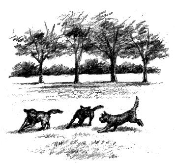 Poor Lucy was a bit bothered, just at first, wondering where her pups had gone. She ran round the room, looking for them, and couldn’t understand why they weren’t there. But then she was taken for a good long walk in the park where she met some of her old friends that she hadn’t seen for ages, including her boyfriend, the great swaggering Jack-the-lad who was the puppies’ dad. They all raced around and chased one another, and did rather a lot of barking, and by the time she got back home Lucy was quite happy to be on her own again, with only the cat for company.