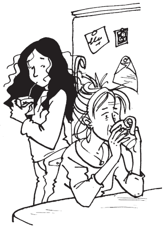 Honestly! Vix may be my best and oldest friend, but I can’t help feeling she doesn’t always stop and think before she opens her mouth. Cracking up. What a thing to say! It worried me almost sick. I crept round Mum like a little mouse, hardly daring even to breathe for fear of upsetting her. I had these visions of her suddenly tearing off all her clothes and running naked into the street and having to be locked up. The Afterthought, being almost totally insensitive where other people’s feelings are concerned, just carried on the same as usual, except that she didn’t actually whinge quite as much. Instead of whining about cornflakes for breakfast instead of sugar puffs, for instance, she simply rolled her eyes and made huffing sounds; instead of screaming that “Dad would let me!” when Mum refused to let her sit up till midnight watching telly, she just did this angry scoffing thing, like “Khuurgh!” and walloped out of the room, slamming the door behind her.