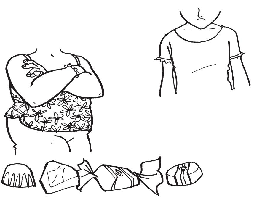 I told Mum about the celery competition and the ball-bearing knees, and Mum said, “Oh, sweetheart, don’t worry! You’ll fill out,” as if she thought I needed comforting. But I don’t! I don’t mind looking like a stick of celery. I don’t even mind knobbly knees! If ever I start to get a bit depressed or self-conscious, I just go and read one of my Harriet Chances. Every single one of Harriet’s characters has secret worries about the way she looks. April Rose, for instance, has no waist. Me, neither! Victoria Plum has “hair like a limp dishcloth”. Just like me! Then there is poor little Sugar Mouse, who agonises about whether she will ever grow any boobs, and Fudge Cassidy, who can’t stop eating chocolates and putting on weight.
