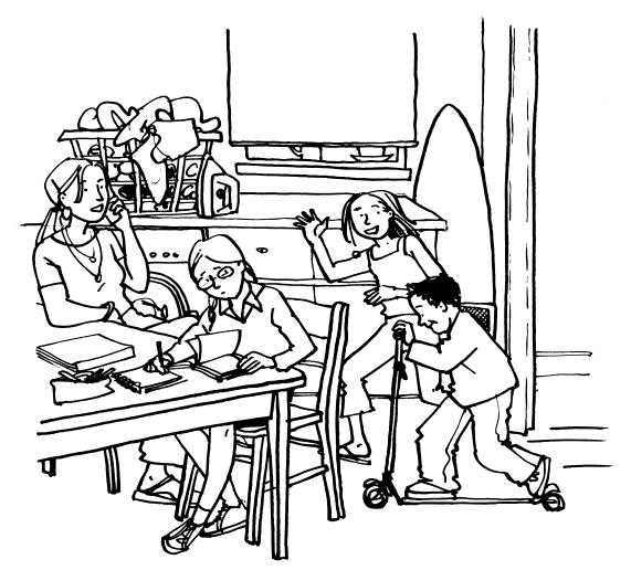 That evening, after tea, I shut myself away in the kitchen to do my homework. The kitchen was the only place that was warm enough since the central heating had been turned off. Mum said we couldn’t afford to heat the whole flat, so now we just had it on in the front room, but I was allowed to have the oven on low in the kitchen. It wasn’t exactly quiet out there cos I could hear the television blaring in the next room, and the person in the flat that joined ours had music on, really loud, but I didn’t mind that so much as the way Sammy and the girls kept crashing in and out.