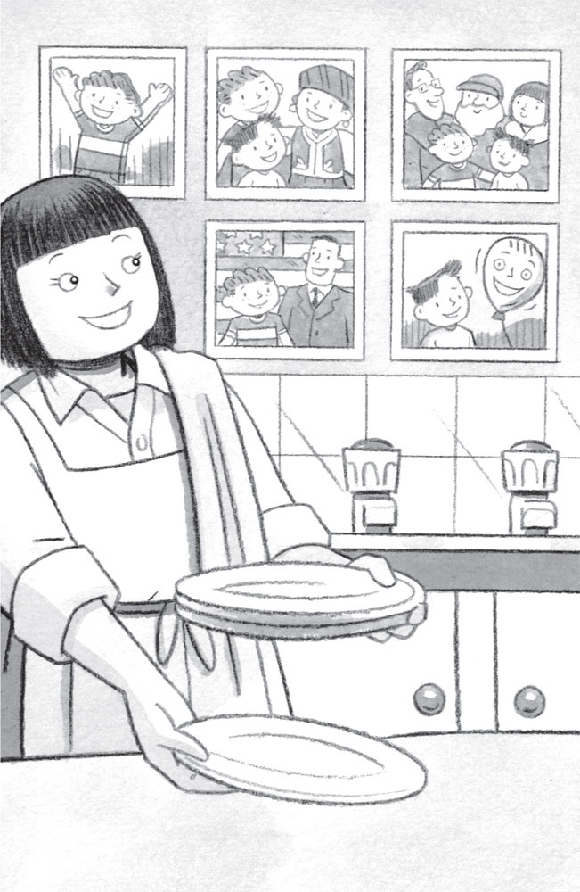 Her glance fell upon a row of photographs on the wall above the sink. There was a smiling Stanley, only half an inch thick, his big bulletin board having fallen from the bedroom wall to rest upon him overnight. Next came reminders of the many family adventures that had come after Stanley’s younger brother, Arthur, had cleverly blown him round again with a bicycle pump. There were the brothers with Prince Haraz, the young genie who had granted wishes for them all after being accidentally summoned by Stanley from a lamp. There was the entire family with Santa Claus and his daughter, Sarah, taken during a Christmas visit to the North Pole. There was the family again in Washington, DC, in the office of the President of the United States, who had asked them to undertake a secret mission into outer space. The last picture showed Arthur standing beside a balloon on which Mrs Lambchop had painted a picture of Stanley’s face. The balloon, its string in fact held by Stanley, had been a valuable guide to his presence, since he was invisible at the time. ‘Boys!’ she called again. ‘Breakfast!’