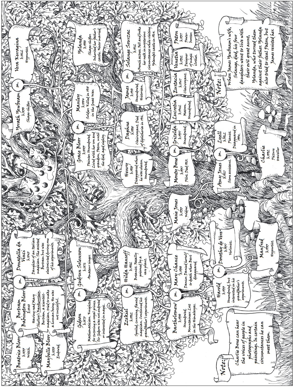 Manfred Bloor Talents Master at Bloor’s Academy. Previously head boy. A hypnotiser. He is descended from Borlath, eldest son of the Red King. Borlath was a brutal and sadistic tyrant. Naren Bloor Adopted daughter of Bartholomew Bloor, Naren can send shadow words over great distances. She is descended from the Red King’s grandson who was abducted by pirates and taken to China. Asa Pike A were-beast. He is descended from a tribe who lived in the Northern forests and kept strange beasts. Asa can change shape at dusk. Billy Raven Billy can communicate with animals. One of his ancestors conversed with ravens that sat on a gibbet where dead men hung. For this talent he was banished from his village. Lysander Sage Descended from an African wise man. He can call up his spirit ancestors. Tancred Torsson A storm-bringer. His Scandinavian ancestor was named after the thunder god, Thor. Tancred can bring rain, wind, thunder and lightning. Gabriel Silk Gabriel can feel scenes and emotions through the clothes of others. He comes from a line of psychics. Emma Tolly Emma can fly. Her surname derives from the Spanish swordsman from Toledo, whose daughter married the Red King. He is therefore an ancestor to all the endowed children. Charlie Bone Charlie can travel into photographs and pictures. Through his father he is descended from the Red King, and through his mother, from Mathonwy, a Welsh magician and friend of the Red King. Dorcas Loom Dorcas can bewitch items of clothing. Her ancestor, Lola Defarge, knitted a shrivelling shawl whilst enjoying the execution of the Queen of France in 1793. Idith and Inez Branko Telekinetic twins, distantly related to Zelda Dobinsky, who has left Bloor’s Academy. Joshua Tilpin Joshua has magnetism. He is descended from Lilith, the Red King’s oldest daughter, and Harken, the evil enchanter who married her. Una Onimous Mr Onimous’s niece. Una is five years old and her endowment is being kept secret until it has fully developed. Olivia Vertigo Descended from Guanhamara, who fled the Red King’s castle and married an Italian Prince. Olivia is an illusionist. The Bloors are unaware of her endowment. Dagbert Endless Dagbert is the son of Lord Grimwald who can control the oceans. His mother took the gold from drowned men’s teeth, and made them into charms to protect her son. Dagbert is a drowner.The endowed are all descended from the ten children of the Red King: a magician-king who left Africa in the twelfth century, accompanied by three leopards.