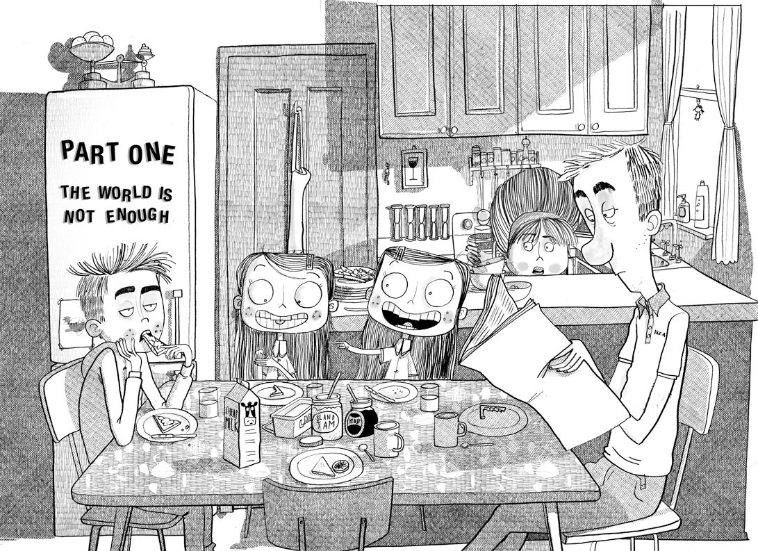 Barry carried on looking at his dad. He had chosen not to recognise his younger twin sisters. Barry often snuck a glance at his dad’s Daily or Sunday Express, as he knew that James Bond would have to be aware of when dangerous stuff was happening in the world, and he had read that some countries did this to other ones. He had read that Iran, for example, did not recognise Israel, calling it instead – his dad had read this phrase out for him – the Zionist entity. Which made it sound all villainous, like Spectre (the secret world-controlling gang in James Bond). So, similarly, he did not call his eight-year-old twin sisters Ginny and Kay, but The Sisterly Entity. Or TSE for short.
