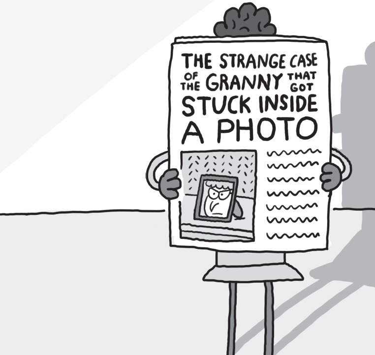 ‘The granny hadn’t got stuck at all,’ smiled Rhubarb. ‘All she’d done was pop to the loo. Meanwhile, her husband decided she’d been sucked into the picture frame on the mantelpiece.’