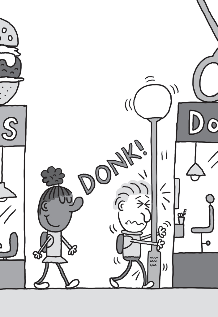 Rhubarb sniggered. ‘Ooh, I like people who try and be funny!’ she said, giving him a nudge, and he boinked into a blue lamppost which had ‘Donut Electric Co’ written on it in dented-in letters.