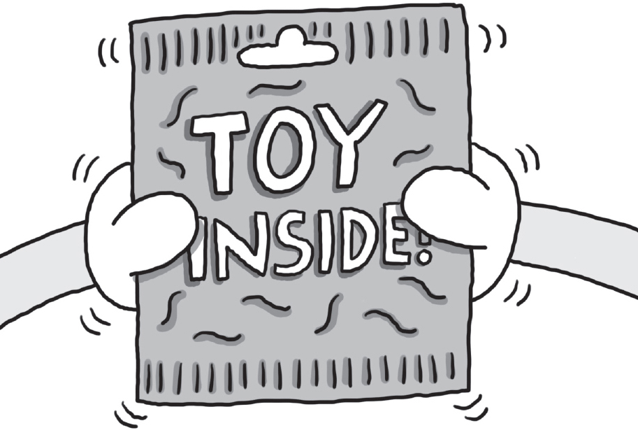 ‘I like guessing what’s inside them,’ said Melvin, pulling one out of the box and giving it a fiddle. ‘Anyway, the packets are more interesting than the toys half the time.’
