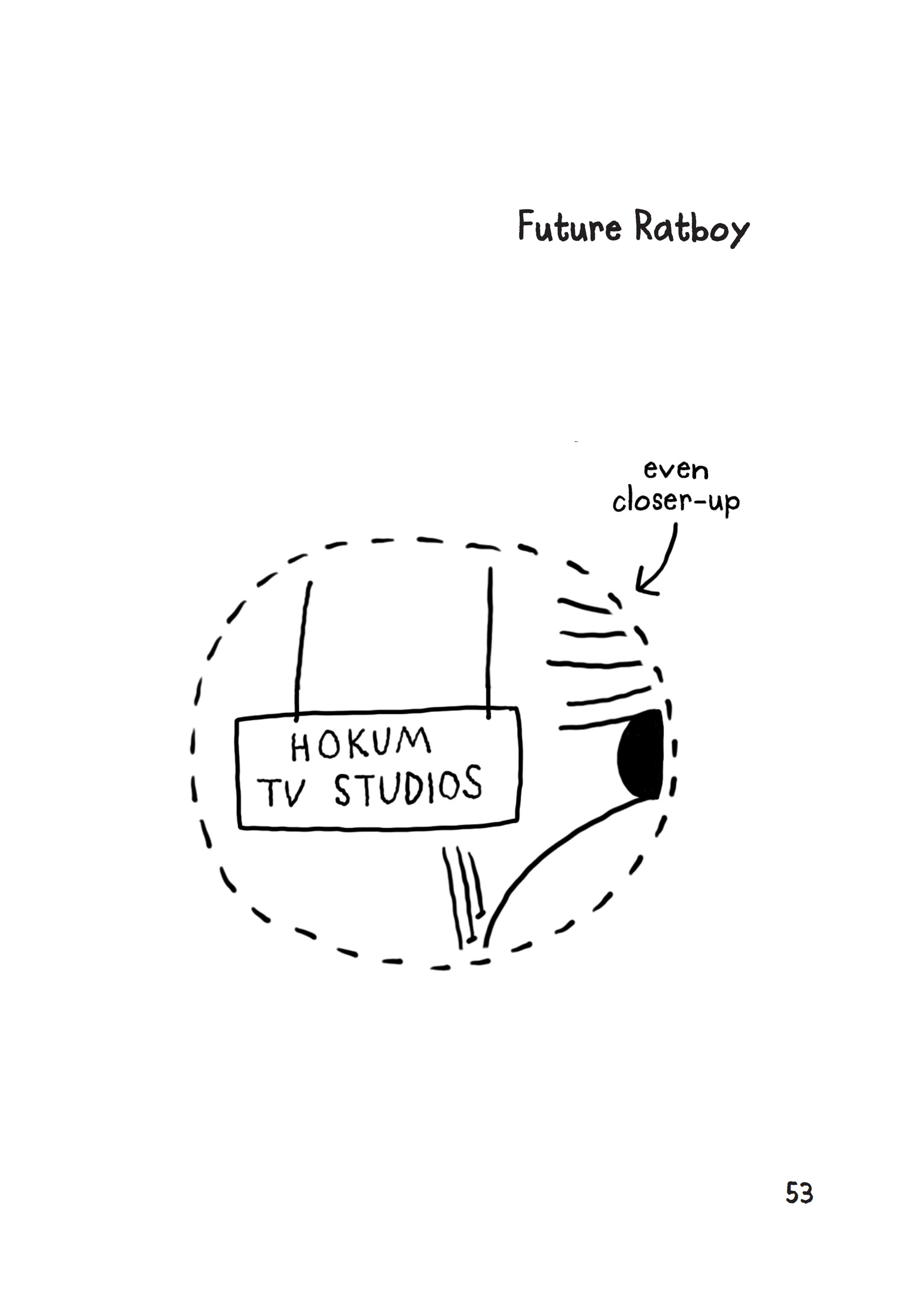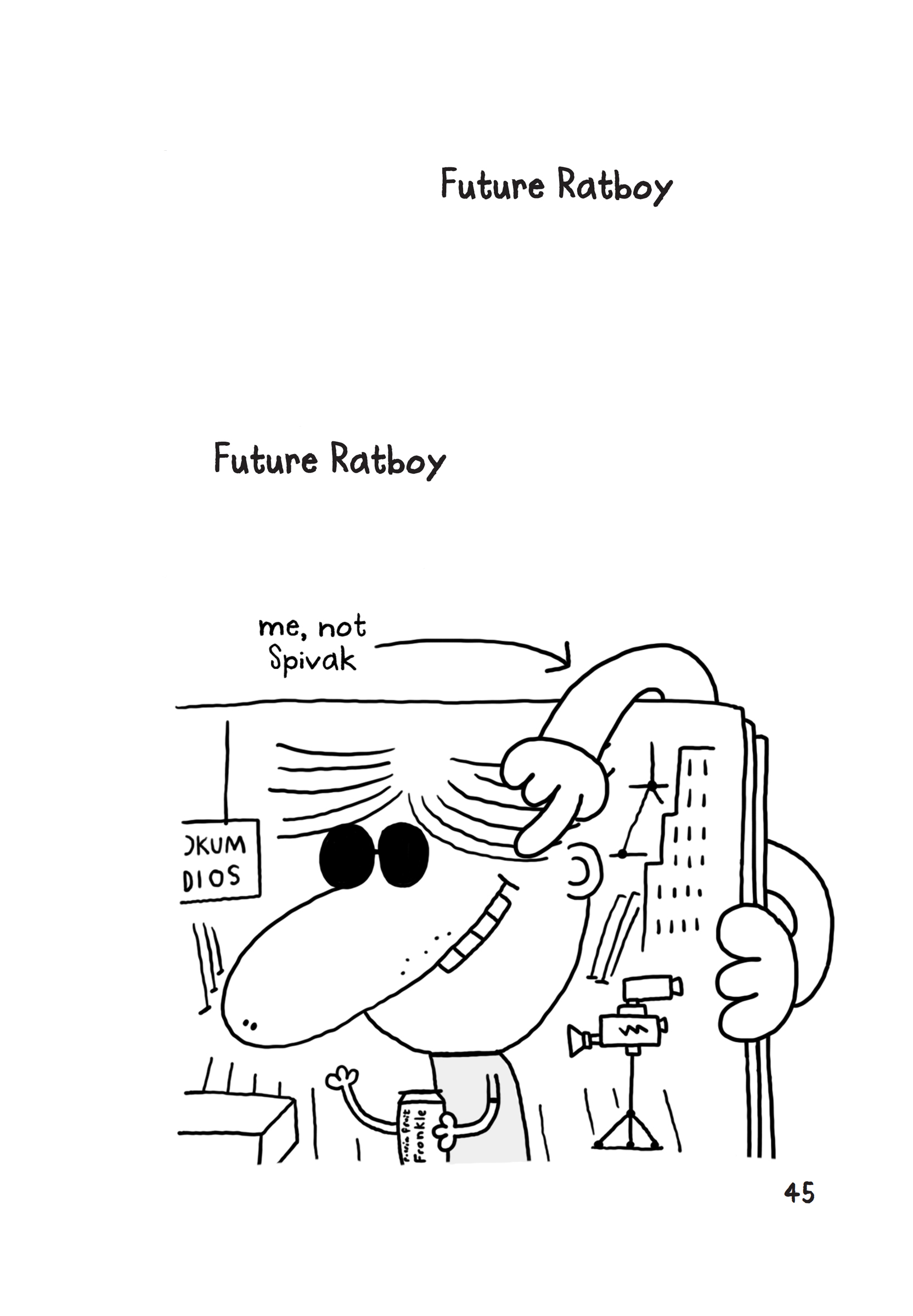 All eight of their eyeballs zoomed in on the background of the photo, which was the set of Future Ratboy. Wooden cut-outs of futuristikeel skyscrapers zigzagged up into the sky. Just behind them, ever-so- slighterly blurry, was a sign.