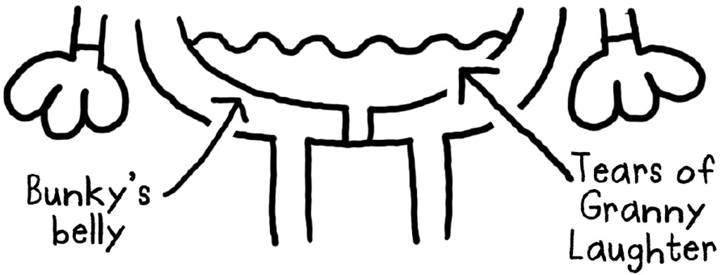 Bunky smiled, not in the keelest bit bothered about me snapping his straw. ‘Plenty more where that came from!’ he said, pointing at a poster for Tears of Granny Laughter right next to where we’d stopped.