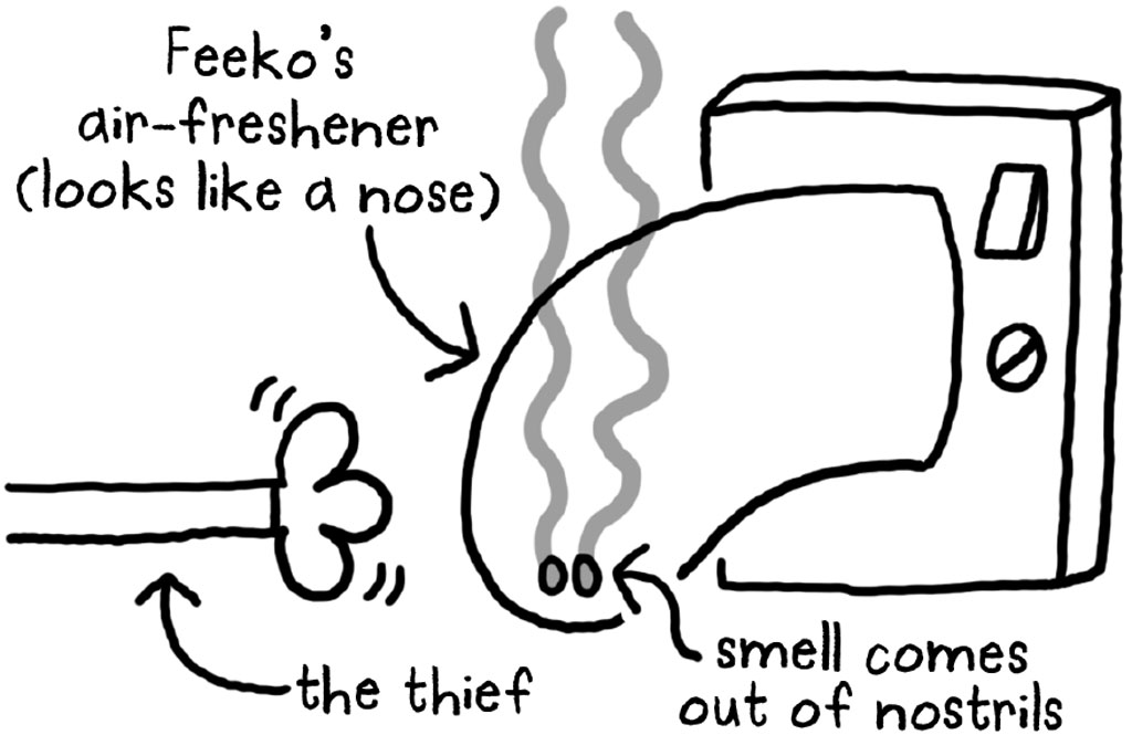 ‘Fanks a lot for saying I was the Phantom Air-Freshener Thief, Anton,’ screeched Sharonella. ‘As if I’d want to steal a stupid air-freshener!’ she scoffed, her perfume wafting up my nostrils. ‘I’ll get you back for this, Mildew!’ she screeched, stomping off again just as Bunky bounded over, zipping up his flies.