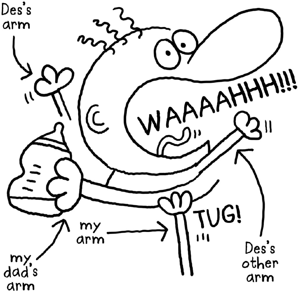 ‘WAAAHHH!!!’ screamed my dad from the downstairs bathroom, where he was changing Desmond Loser the Second’s nappy for the nineteenth time that morning. ‘DESMOND’S WEED IN MY FACE AGAIN!’