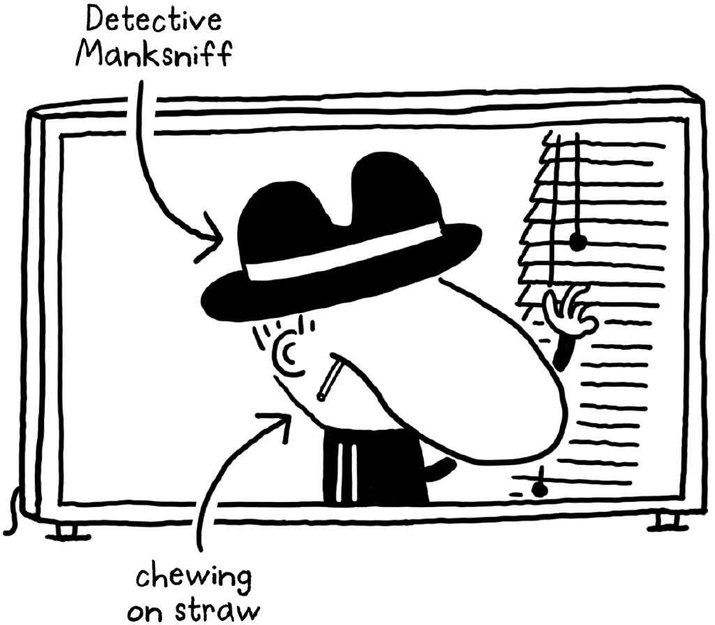 ‘It’s not your hat either,’ I mumbled. ‘Detective Manksniff wears a keel detective hat, and you don’t wear a hat at all,’ I said, flicking Bunky’s hair at the front, where it sticks up like a hand.