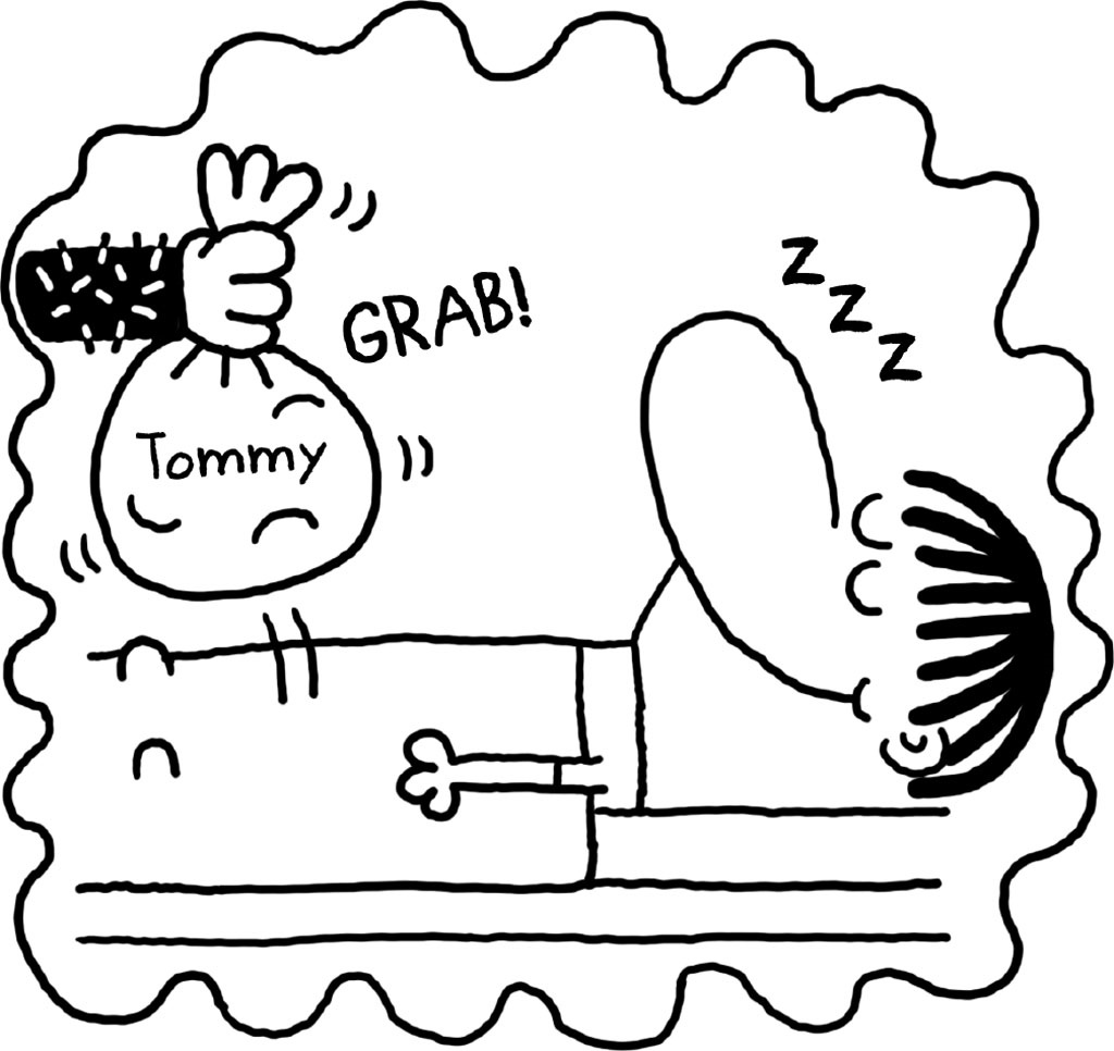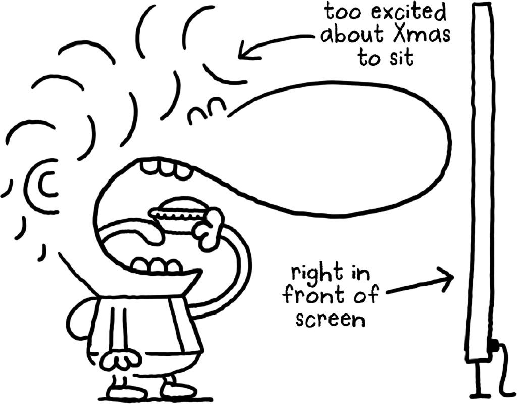 ‘BOO, HOO, HOO!’ roars Terry, snatching a kiddywinkle’s stocking and climbing out the window. Except this time Santa spots him.