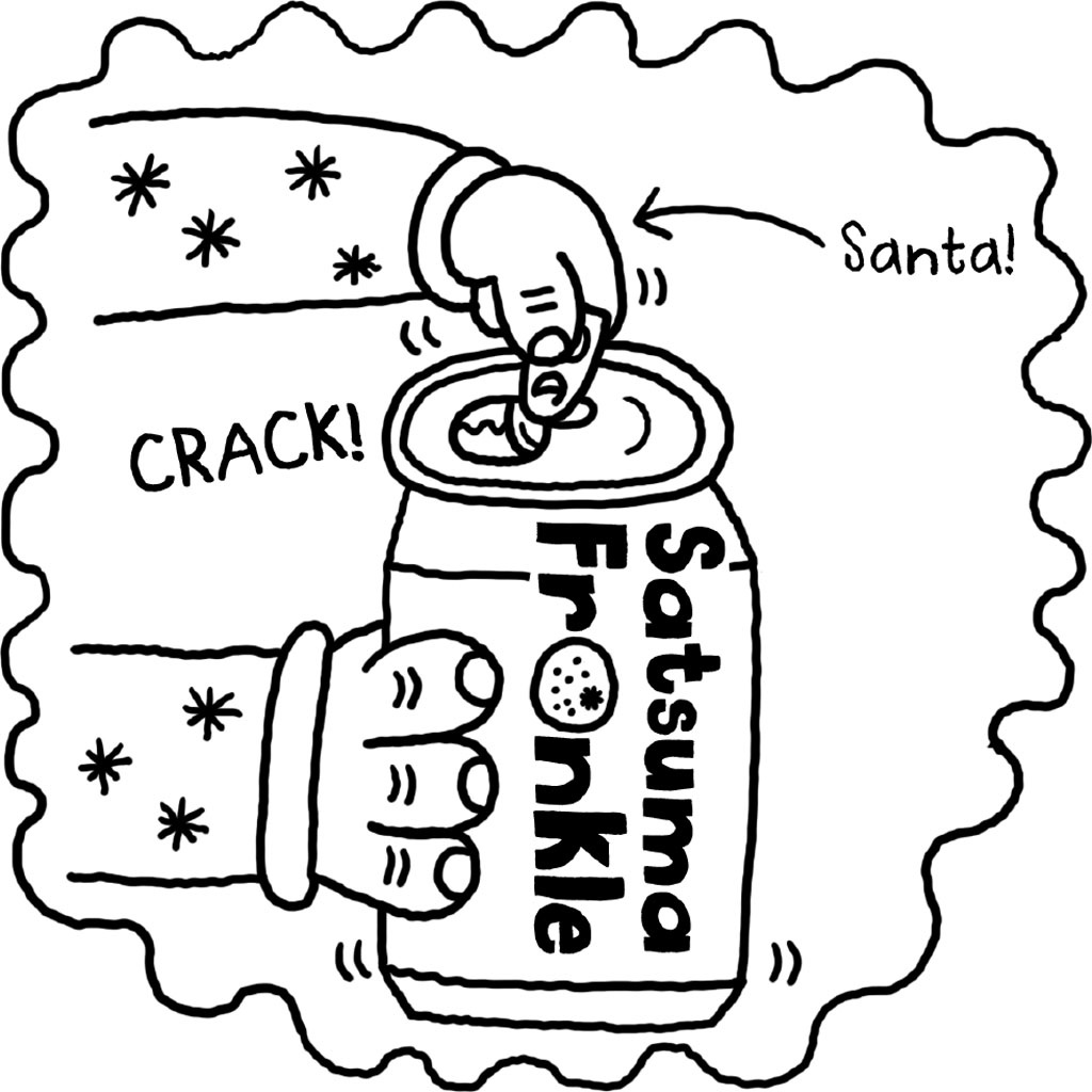 ‘OH, HO, NO you don’t!’ cries Santa, and he wraps up his little brother like a naughty pressie and chucks him in the bin. Then Santa pulls a can of Satsuma Fronkle out of his pocket and takes a sip.