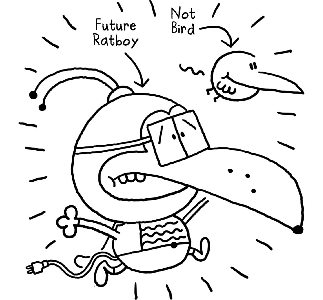 Future Ratboy is mine and Bunky’s favourite TV show. It’s all about Future Ratboy and his annoying sidekick Not Bird.
