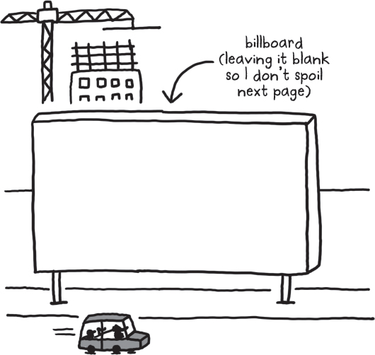 Behind the billboard, half a real-life skyscraper was sticking out of the ground. Men in yellow plastic hats were dotted around all over it, hammering planks and eating sandwiches.