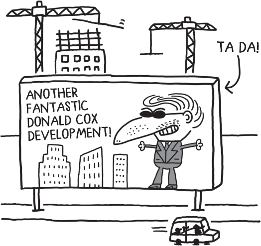 ‘ANOTHER FANTASTIC DONALD COX DEVELOPMENT!’ boomed the words on the billboard, next to a mahoosive photo of a man in a suit with sunglasses on. That makes it sound like the suit was wearing sunglasses - it wasn’t, the man was.