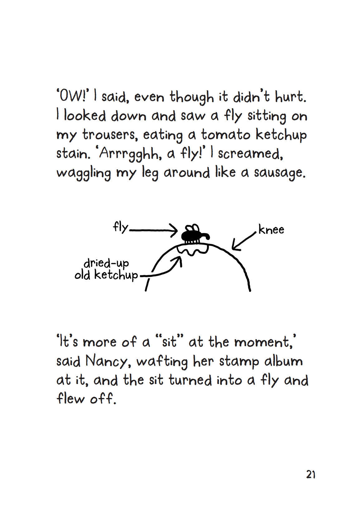 ‘OW!’ I said, even though it didn’t hurt. I looked down and saw a fly sitting on my trousers, eating a tomato ketchup stain. ‘Arrrgghh, a fly!’ I screamed, waggling my leg around like a sausage.