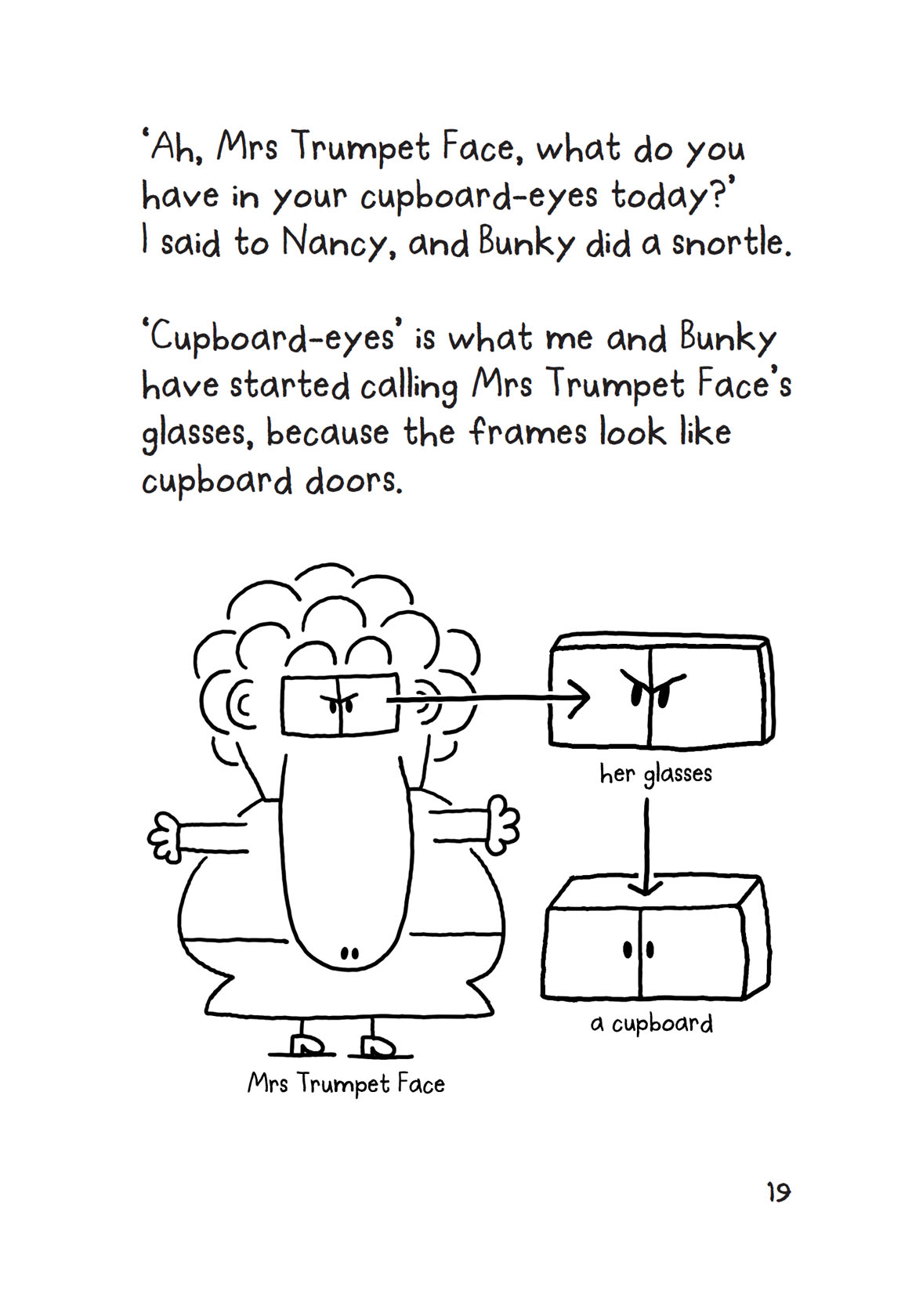 ‘Cupboard-eyes’ is what me and Bunky have started calling Mrs Trumpet Face’s glasses, because the frames look like cupboard doors.