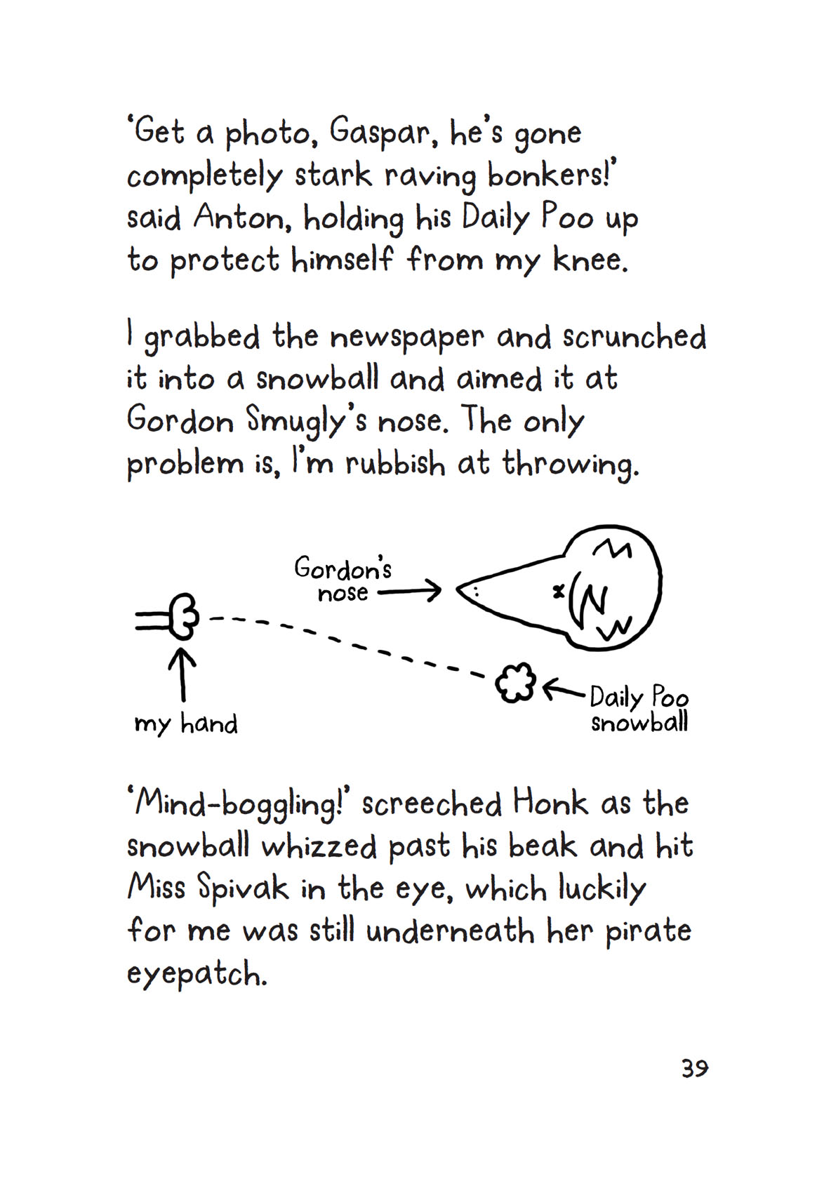 ‘Mind-boggling!’ screeched Honk as the snowball whizzed past his beak and hit Miss Spivak in the eye, which luckily for me was still underneath her pirate eyepatch.