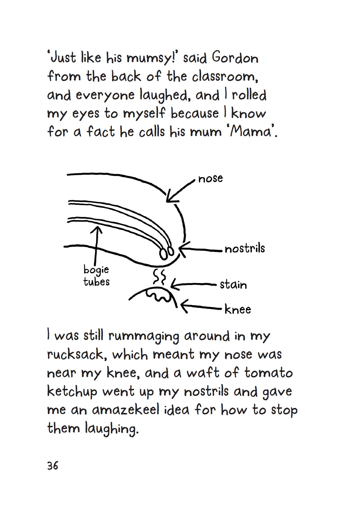 I was still rummaging around in my rucksack, which meant my nose was near my knee, and a waft of tomato ketchup went up my nostrils and gave me an amazekeel idea for how to stop them laughing.