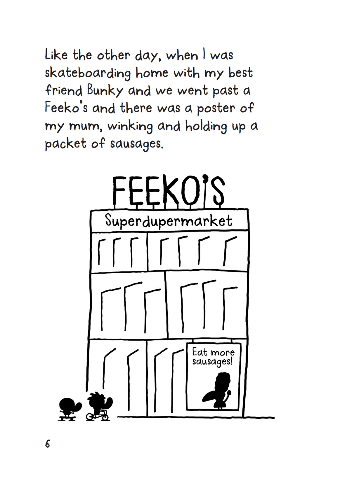 Like the other day, when I was skateboarding home with my best friend Bunky and we went past a Feeko’s and there was a poster of my mum, winking and holding up a packet of sausages.