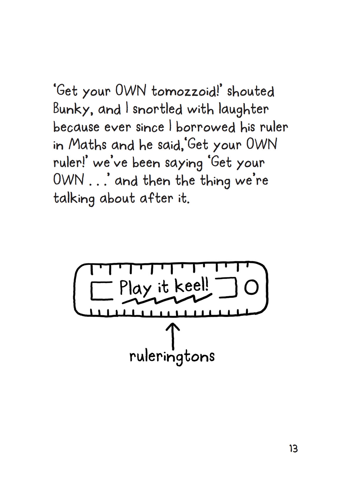 ‘Get your OWN tomozzoid!’ shouted Bunky, and I snortled with laughter because ever since I borrowed his ruler in Maths and he said,‘Get your OWN ruler!’ we’ve been saying ‘Get your OWN . . .’ and then the thing we’re talking about after it.