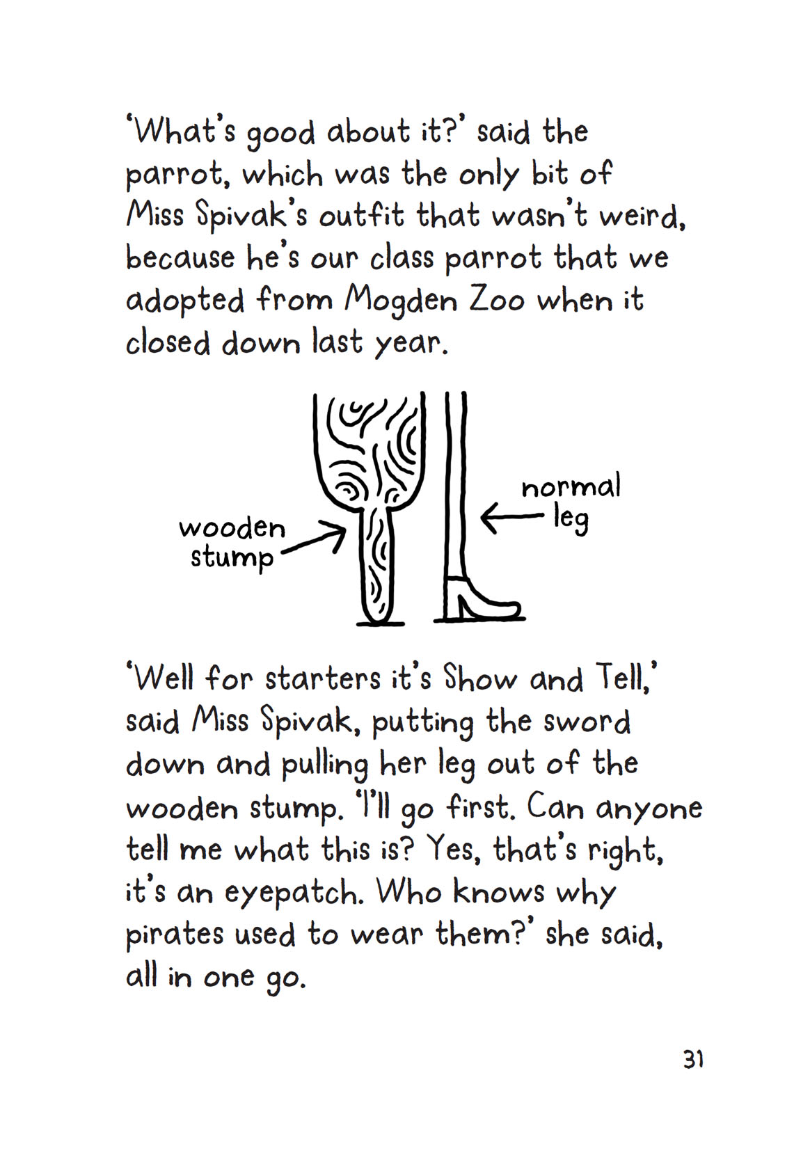 ‘Well for starters it’s Show and Tell,’ said Miss Spivak, putting the sword down and pulling her leg out of the wooden stump. ‘I’ll go first. Can anyone tell me what this is? Yes, that’s right, it’s an eyepatch. Who knows why pirates used to wear them?’ she said, all in one go.