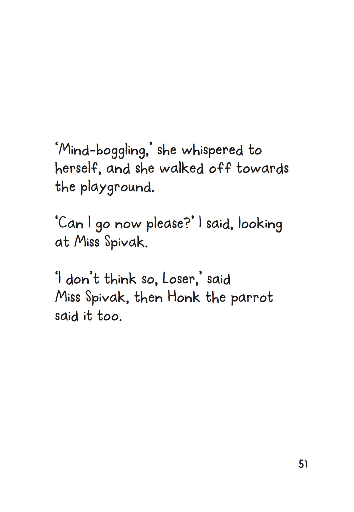 ‘I don’t think so, Loser,’ said Miss Spivak, then Honk the parrot said it too.