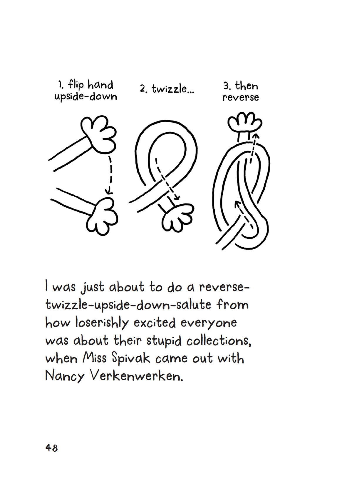 I was just about to do a reverse- twizzle-upside-down-salute from how loserishly excited everyone was about their stupid collections, when Miss Spivak came out with Nancy Verkenwerken.