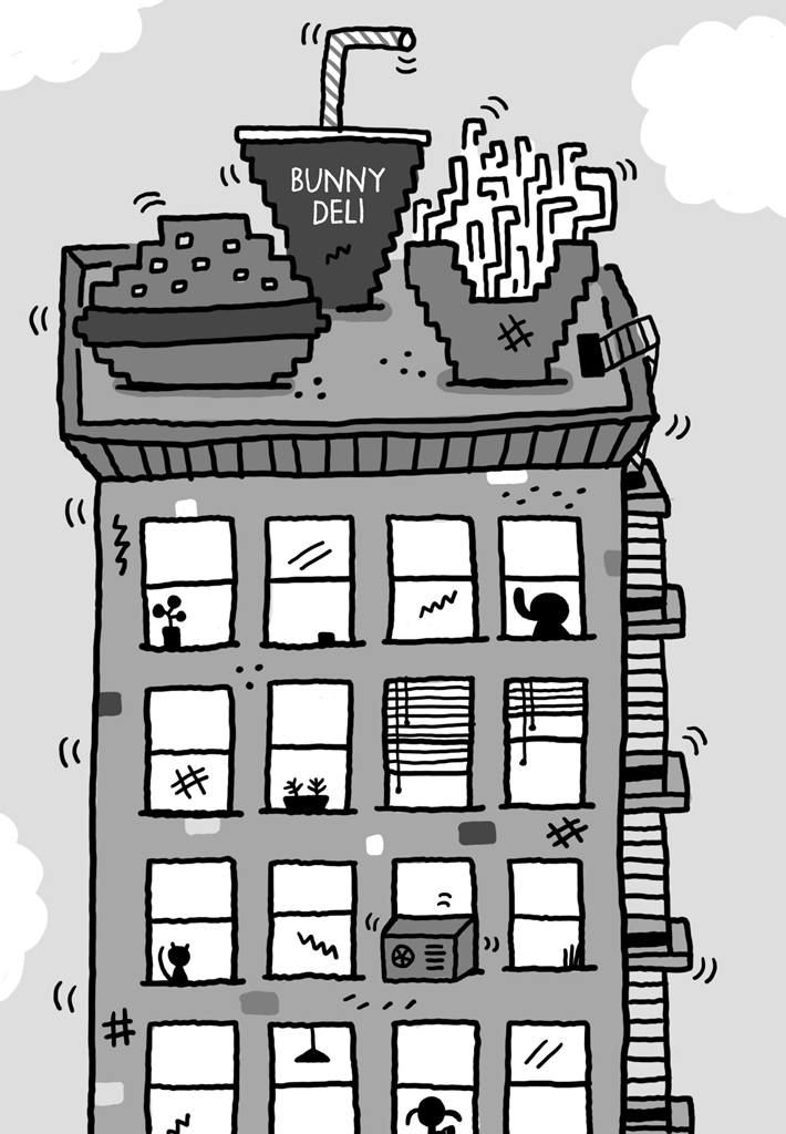 He pointed up the street to a tall brown building with a shop at the bottom of it called ‘Bunny Deli’. On its roof sat a gigantic plastic cheeseburger and chips. Next to them stood an enormous blue cup with a stripy red-and-white straw sticking out of it.