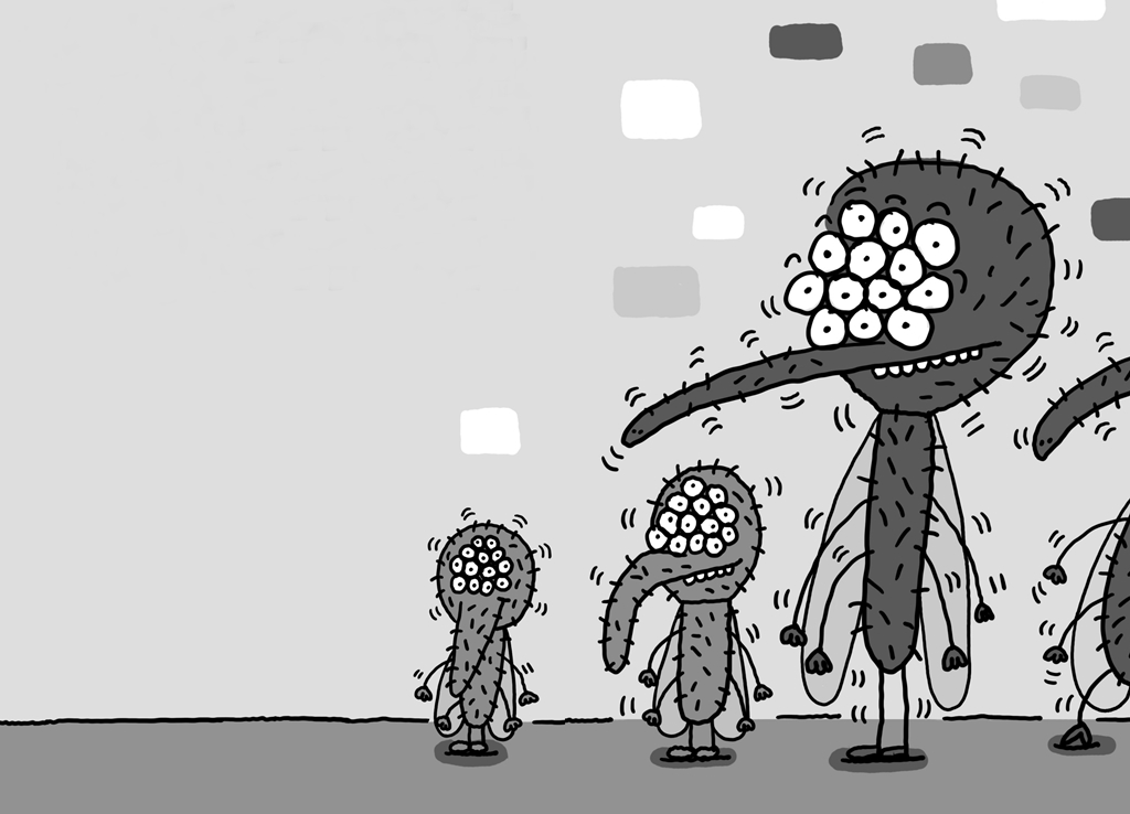 His arms and legs had hairy spikes sticking out all over them, and on his back, neatly folded up like a see-through tablecloth, hung a giant pair of wings. Next to him was a woman-sized fly and two kid-sized ones.