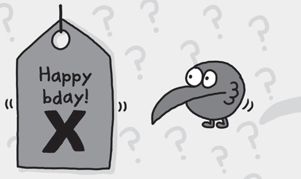 Not Bird flew up to the label and turned it over with his beak. ‘Happy bday!’ said the mayor, reading out what was written on it. Underneath the writing was a big black ‘X’ for a kiss.