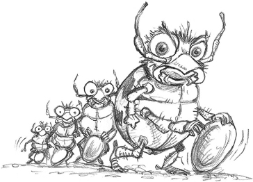 He was about to knock it forward when he heard a shuffling sound behind him. He turned around to see a family of green tiger beetles enter the clearing. Each beetle was pushing a small egg in front of it, the same way Lurch pushed poo. Zap’s wings trembled – with their hard green bodies and dark eyes they looked really scary. And he knew they liked to eat weevils!