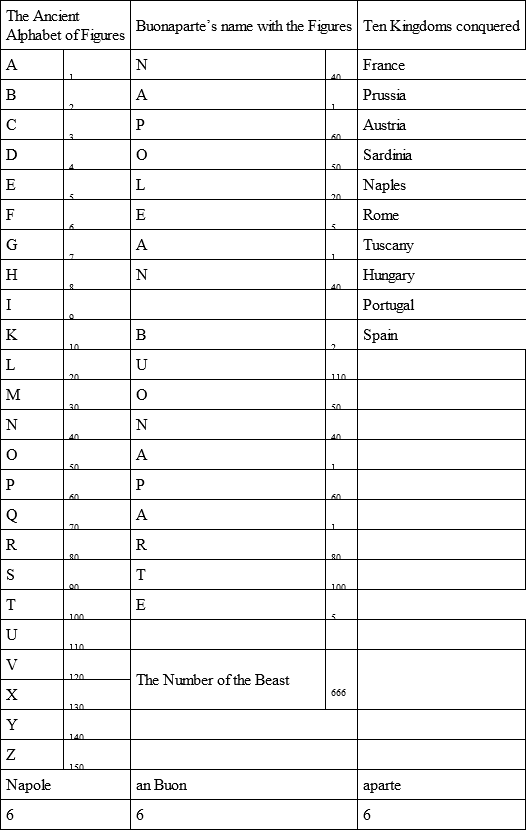 In a curious little book called The Corsican’s Downfall, by a Royal Arch Mason, published at Mansfield in 1814, at p. 6, it says, with reference to the numeration, ‘The oldest treatise on the theory of arithmetic is comprised in the seventh, eighth, and ninth books of Euclid’s Elements, about two hundred and eighty years before the Christian era. The first author of any consequence who used the modern way of computing by figures, instead of letters of the alphabet, was Jordanus of Namur, who flourished about 1200; and his arithmetic was afterwards published and demonstrated by Johannis Faber Stapulensis, in the fifteenth century. The name, then, and number of the Beast must be discovered (if at all) by the ancient method of computation in use at the time when the prophecies were written.’