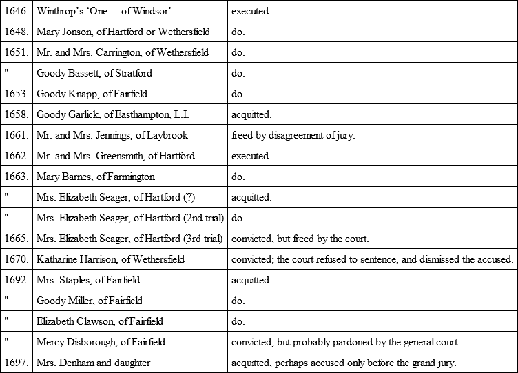 The following are the known cases of witchcraft in Connecticut; but, as far as I can see, none present any particular features of interest for the reader.124