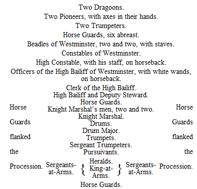 “Given at our Court at Windsor, the 26th day of April,1802, in the forty-second year of our reign“God save the King.”On the 29th of April, a public proclamation of the same was made, and it must have been a far more imposing spectacle than the very shabby scene displayed in 1856. All mustered in the Stable-yard, St. James’s. The Heralds and Pursuivants were in their proper habits, and, preceded by the Sergeant Trumpeter with his trumpets, the Drum Major with his drums, and escorted on either side by Horse Guards, they sallied forth, and read aloud the Proclamation in front of the Palace. We can picture the roar of shouting, and the waving of hats, after the Deputy Garter’s sonorous “God save the King!” A procession was then formed, and moved solemnly towards Charing Cross, where another halt was made, and the Proclamation was read, the Herald looking towards Whitehall. The following is the order of the procession: