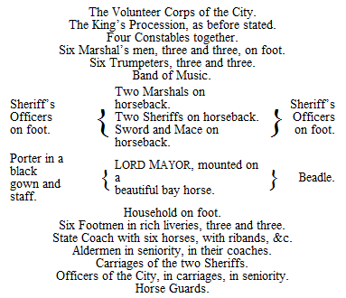 The Proclamation having been read a fourth time, at Wood Street, they went on to the Exchange, read it there, and yet once again, at Aldgate pump, after which they returned, and, halting at the Mansion House, broke up, the Heralds going to their College, at Doctor’s Commons, the various troops to their proper destinations; and so ended a very beautiful sight, which was witnessed by crowds of people, both in the streets, and in the houses, along the route.