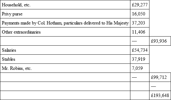 On May 21 the King sent a message to the Commons, in which he says, 'His Majesty could not, however, expect, or desire the assistance of the House, but on a well grounded expectation that the Prince will avoid contracting any new debts, in future. With a view to this object, and from an anxious desire to remove every possible doubt of the sufficiency of the Prince's income to support amply the dignity of his situation, his Majesty has directed a sum of £10,000 per annum to be paid out of his civil list, in addition to the allowance which his Majesty has hitherto given him; and his Majesty has the satisfaction to inform the House that the Prince of Wales has given his Majesty the fullest assurances of his firm determination to confine his future expences within his income; and has, also, settled a plan for arranging those expences in the several departments, and for fixing an order of payment under such regulations as his Majesty trusts will effectually secure the due execution of the Prince's intentions.'