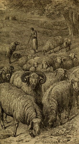 Noontide is the general time for watering the Sheep, and towards that hour all the flocks may be seen converging towards their respective wells, the shepherd at the head of each flock, and the Sheep following him. See how forcible becomes the imagery of David, the shepherd poet, "The Lord is my Shepherd; I shall not want. He maketh me to lie down in green pastures (or, in pastures of tender grass): He leadeth me beside the still waters" (Ps. xxiii. 1, 2). Here we have two of the principal duties of the good shepherd brought prominently before us,—namely, the guiding of the Sheep to green pastures and leading them to fresh water. Very many references are made in the Scriptures to the pasturage of sheep, both in a technical and a metaphorical sense; but as our space is limited, and these passages are very numerous, only one or two of each will be taken.
