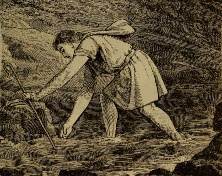 DAVID GATHERS STONES FROM THE BROOK TO CAST AT GOLIATH.