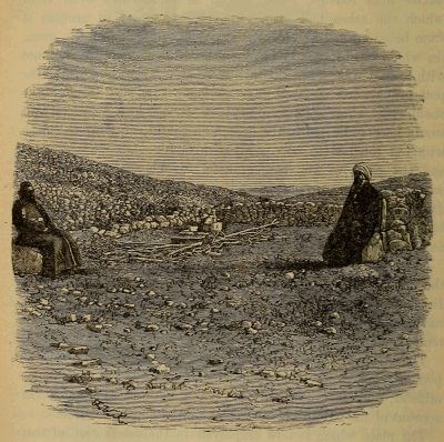 The place which is now employed in the celebration of this rite is a level spot about two hundred yards from the summit of the mountain, a place which is apparently selected on account of its comparative quiet and seclusion. Dean Stanley thinks that in former times, when the Samaritans were the masters of the country, they celebrated the sacrifice on the sacred plateau on the very summit of the mountain, so that the rite could be seen for a vast distance on every side. Now, however, the less conspicuous place is preferred. By the kindness of the Palestine Exploration Society, I am enabled to present the reader with a view of this sacred spot, taken from a photograph made an hour or two before the time of sacrifice. The rough, rugged character of the mountain is shown by this illustration, though not so well as in several other photographs of Gerizim, in which the entire surface seems to be loosely covered with stones like those of which the low wall is built. Near the centre of the illustration may be seen a pile of sticks and the tops of two caldrons, on each of which a stone is laid to keep the cover from being blown off by the wind. These sticks nearly fill a trench in which the caldrons are sunk, and their use will be presently seen on reading Dean Stanley's narrative. In the far distance are the plains of Samaria, and the long-drawn shadows of the priest and his nephew, and probable successor, show that the time of sacrifice is rapidly approaching.